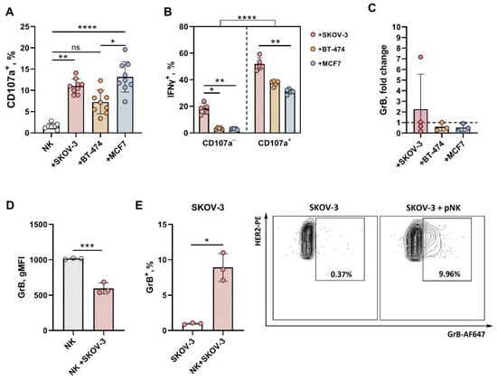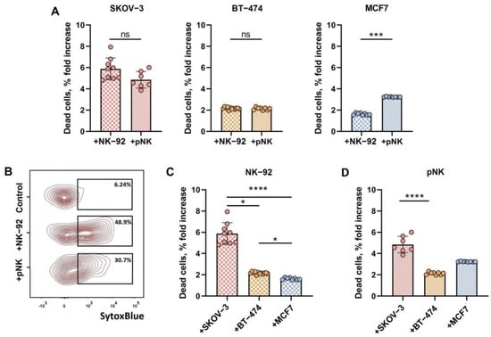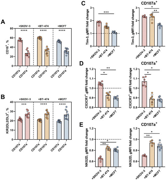 3.3. Various Degrees of NK-Cell-Mediated Cytotoxicity Against SKOV-3, BT-474 and MCF7 Spheroids Are Associated with Different Patterns of NKG2D, Tim-3 and CX3CR1 Surface Expression in pNK Cells