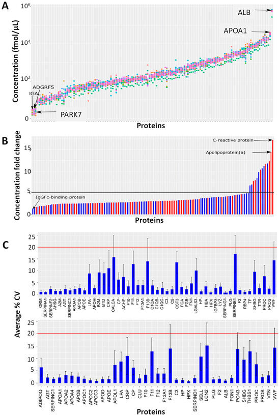 - Gaither, C.; Popp, R.; Mohammed, Y.; Borchers, C.H. Determination of the concentration range for 267 proteins from 21 lots of commercial human plasma using highly multiplexed multiple reaction monitoring mass spectrometry. Analyst 2020, 145, 3634–3644. [Google Scholar] [CrossRef]