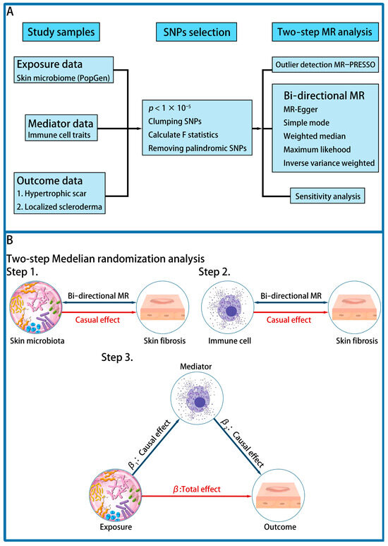 The study design is summarized in the flowchart in Figure 1A. A two-step MR was performed to determine the effects of mediation. In step 1, the impact of skin microbiota on skin fibrosis was determined by bi-directional MR. In step 2, skin fibrosis-related immune cell responses were determined by bi-directional MR. Then, causal effects of skin fibrosis-related skin microbiota on immune cells were established. In step 3, a mediated analysis was performed to verify whether immune cells mediated the impact of skin microbiota on skin fibrosis (Figure 1B) [20,21].