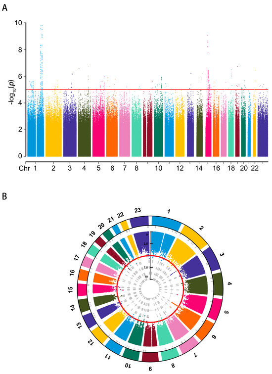 The threshold of SNP selection. (A) The Manhattan plot of the Hypertrophic scar trait (L12_HYPETROPHICSCAR) (threshold = 1 × 10−5). (B) The circle Manhattan plot of the Localized scleroderma trait (L12_LOCALSCLERODERMA) (threshold = 1 × 10−5).
