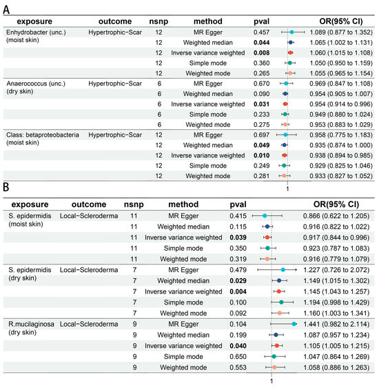 A total of six skin microbiota were associated with skin fibrosis. Enhydrobacter (unc.) (moist skin) was positively associated with hypertrophic scar (odds ratio [OR] 1.060 [95% confidence interval [CI] 1.015, 1.108], p = 0.008). Anaerococcus (unc.) (dry skin) was negatively associated with hypertrophic scar (OR 0.954 [95% CI 0.941, 0.996], p = 0.031). Class: betaproteobacteria (moist skin) was associated with a decreased risk of hypertrophic scar (OR 0.938 [95% CI 0.894, 0.985], p = 0.010) (Figure 3A). S. epidermidis (moist skin) showed potentially negative associated with local scleroderma (OR 0.917 [95% CI 0.844, 0.996], p = 0.039), while S. epidermidis (dry skin) showed potentially positive relationship with local scleroderma (OR 1.145 [95% CI 1.043, 1.257], p = 0.004). Besides, R. mucilaginosa (dry skin) was positively associated with local scleroderma (OR 1.105 [95% CI 1.005, 1.215], p = 0.040) (Figure 3B). Sensitivity analyses showed no horizontal pleiotropy by MR-Egger test, no significant heterogeneity by Cochran’s Q test and no horizontal pleiotropy by an MR-PRESSO analysis. All p-values were >5 × 10−2. Detailed information was provided in Supplementary Table S2. There was no reverse effect between these skin microbiota and skin fibrosis (Supplementary Table S3). The reliability was proved by a leave-one-out analysis (Figure S1). Causal associations between skin microbiota and skin fibrosis were exhibited in forest plots (Figure S2). The overall effect of skin microbiota on skin fibrosis was shown by scatter plots (Figure S3). Funnel plots were also performed to show the heterogeneity of evaluated SNPs in skin microbiota (Figure S4).
