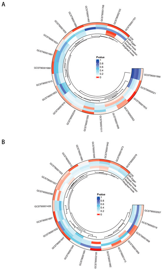SNPs associated with each trait (p < 1 × 10−5) were extracted for further analysis [25]. The red line represents the threshold (p < 1 × 10−5) in the Hypertrophic scar and Localized-scleroderma traits (Figure 2A,B). The linkage disequilibrium of SNPs met the condition with the EUR population reference (r2 < 0.01 and clump distance > 10,000 kb). SNPs with an F-statistic < 10 were excluded to avoid weak bias. Palindromic SNPs were removed after matching the outcome [26].