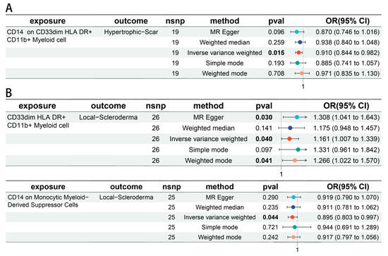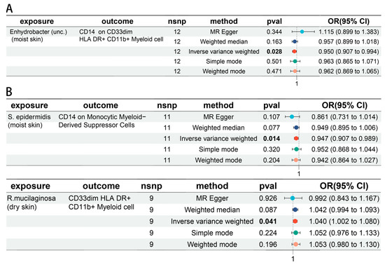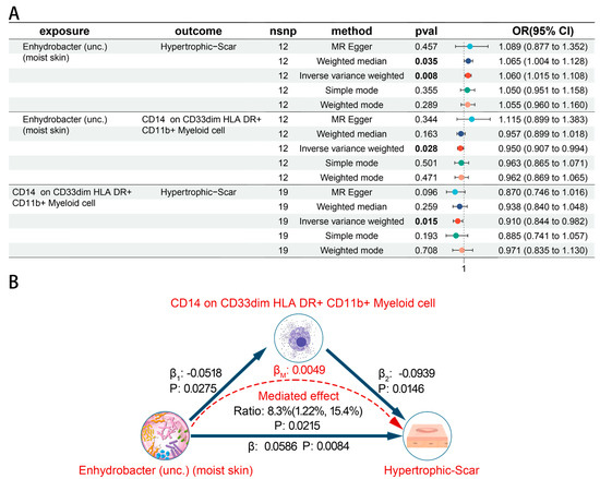 A bi-directional MR analysis was performed for the relationship between skin microbiota and immune cells. Enhydrobacter (unc.) (moist skin) was negatively associated with CD14 on CD33dim HLA DR+ CD11b+ Myeloid cell (OR = 0.950, 95% CI = 0.907–0.994, p = 0.028) (Figure 5A). S. epidermidis (moist skin) was negatively associated with CD14 on Monocytic Myeloid-Derived Suppressor Cells (OR = 0.947, 95% CI = 0.907–0.989, p = 0.014). R. mucilaginosa (dry skin) was positively associated with CD33dim HLA DR+ CD11b+ Myeloid cell (OR = 1.040, 95% CI = 1.002–1.080, p = 0.041) (Figure 5B). Detailed information was provided in Supplementary Table S6. Moreover, CD14 on CD33dim HLA DR+ CD11b+ Myeloid cell was associated with a decreased risk of hypertrophic scar (OR = 0.910, 95% CI = 0.844–0.982, p = 0.015) (Figure 6A). CD33dim HLA DR+ CD11b+ Myeloid cell was associated with an increased risk of local scleroderma (OR = 1.161, 95% CI = 1.007–1.339, p = 0.040), and CD14 on Monocytic Myeloid-Derived Suppressor Cells was associated with a decreased risk (OR = 0.895, 95% CI = 0.803–0.997, p = 0.044) (Figure 6B).