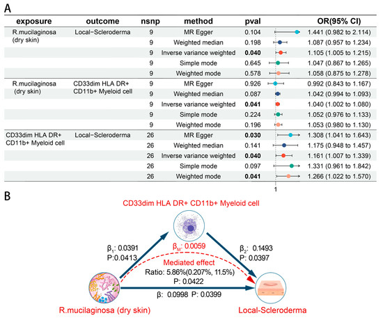 Causal effects between skin microbiota, immune cells, and Localized scleroderma trait. (A) Forest plots of causal effects between skin microbiota, immune cells, and Localized-scleroderma trait. (B) The mediated effect of skin microbiota on Localized scleroderma trait through immune cells.
