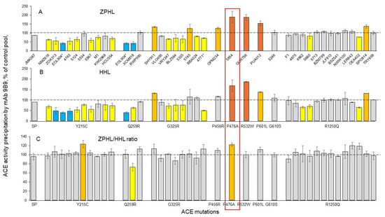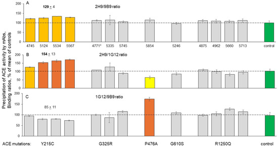 - The ACE phenotyping method utilizes the precipitation of ACE by different mAbs in combination with the subsequent measurement of ACE activity [28,31,32,49] to quantitatively estimate the effects of these ACE mutations. It also allows for the identification of patients with transport-deficient ACE mutations that are characterized by a substantial decrease in blood ACE levels (for example, carriers of the common ACE mutations Y215C and G325R).