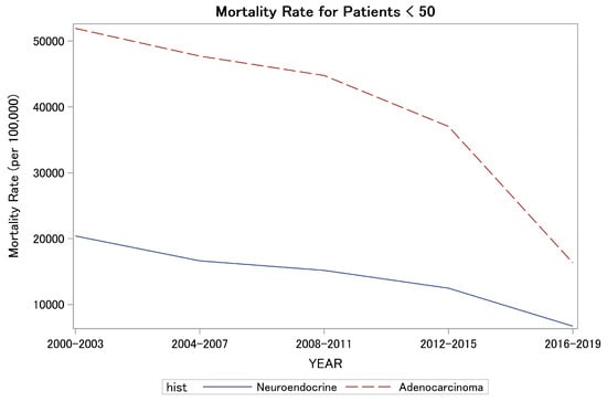 Next, we examined the mortality trends. The rate of deaths per 100,000 decreased from 49,554 in 2000–2003 to 15,527 in the period between 2016 and 2019. Despite the rising incidence, there was a numerical improvement in mortality rates in recent years; the YONEN mortality rate decreased from 20,403 per 100,000 in 2000–2003 to 6705.3 per 100,000 in 2016–2019 (Figure 1). A similar magnitude of decrease was observed in the YOADC group, from 51,928.6 per 100,000 in 2000–2003 to 16,331.9 in 2016–2019 (p < 0.001) (Figure 1).