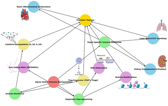 Hence, understanding immune resilience, i.e., the capacity of the immune system to recover following septic insults, is pivotal in developing treatments that not only mitigate acute hyperinflammation but also prevent long-term immune dysfunction [12,13,14,15,16]. Immune resilience can be shaped by various factors, including the dynamic regulation of immune cells, cytokine networks, and immune checkpoints. Furthermore, recent studies highlight the role of epigenetic reprogramming in sepsis, where immune cells undergo lasting changes in gene expression due to DNA methylation, histone modifications, and non-coding RNA regulation [17,18,19]. These epigenetic changes can either promote trained immunity or, conversely, contribute to chronic immunosuppression, influencing clinical outcomes and long-term survival. This narrative review addresses the following three central themes: how organ-specific immune responses contribute to the variability in clinical presentations and outcomes in sepsis, what the molecular mechanisms underlying immune resilience are, and how epigenetic reprogramming influences both immune dysfunction and recovery. By understanding the molecular mechanisms driving immune dysfunction, we can explore new avenues for precision-based therapies that target both the acute and chronic phases of sepsis, such as those processes shown in (Figure 1).