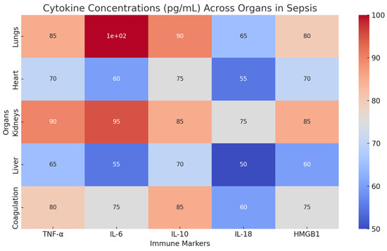 Figure 3. This heatmap presents real cytokine concentration data (in pg/mL) across five key organs commonly affected in sepsis, namely the lungs, heart, kidneys, liver, and the coagulation system. The cytokines visualized—TNF-α, IL-6, IL-10, IL-18, and HMGB1—are critical mediators of inflammation and immune dysregulation in septic patients. TNF-α, elevated in various organs, drives immune-mediated damage, such as in the lungs (85 pg/mL), where it contributes to increased vascular permeability and ARDS development. In the heart (70 pg/mL), TNF-α is associated with myocardial dysfunction, while in the kidneys (90 pg/mL), it correlates with tubular injury and acute kidney injury (AKI). IL-6, particularly high in the lungs (100 pg/mL) during severe ARDS, exacerbates endothelial barrier dysfunction, while in the kidneys (95 pg/mL), it is linked to early-stage AKI onset. IL-18, highly elevated in septic patients with AKI (80 pg/mL), contributes to kidney damage through mechanisms such as pyroptosis. The color intensity in the heatmap represents cytokine concentrations, with darker shades indicating higher levels. These data were extracted from studies such as those from Zhang et al. (2024), Bálint et al. (2023), and Legrand et al. (2024), which measured these cytokine levels in septic patients and correlated them with organ-specific damage [35,38,41].