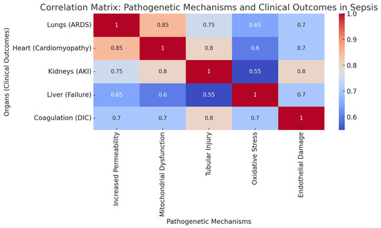 Figure 4. The matrix plot (heatmap) visualizes the correlation between pathogenetic mechanisms (e.g., increased permeability, mitochondrial dysfunction) and clinical outcomes (e.g., ARDS, AKI) in sepsis. The data are derived from studies that quantified the impact of immune dysregulation on organ-specific outcomes using clinical metrics like oxygenation indices, ejection fraction for the heart, and AKI severity scores (e.g., RIFLE, AKIN). The values in the heatmap represent correlation coefficients (scaled from 0 to 1.0), with darker colors indicating stronger correlations, meaning that specific pathogenetic mechanisms, such as tubular injury, are strongly associated with corresponding clinical outcomes like acute kidney injury.