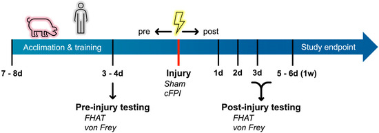 Ultimately, this study marks the first application of the FHAT and von Frey somatosensory sensitivity test in a minipig model of diffuse mild TBI. While the physiological translatability of pigs to human brain pathology has become more established, work is still needed to develop and validate specific behavioral assays in pig models of TBI. Further, future studies should be done to associate these behavioral changes with quantitative pathological and molecular data in order to elucidate the underlying mechanisms that evoke altered behavioral and sensory outcomes following traumatic brain injury. As there were significant changes observed at 1 w post-injury, investigations into the progression of these behavioral changes over longer post-injury timepoints would also be warranted. Finally, as there are so few investigations into behavioral changes following TBI in the pig, the findings presented in the current study should be replicated and expanded upon in future studies.