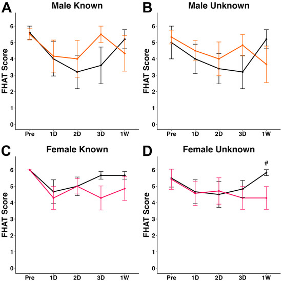 Plots of mean forced human approach test (FHAT) score for (A,B) male sham (n = 5, grey lines) and TBI (n = 6, orange lines) and (C,D) female sham (n = 6, grey lines) and TBI (n = 7, pink lines. Each FHAT test was performed by both a (A,C) known and (B,D) unknown experimenter. # p < 0.05 compared to timepoint-matched sham.