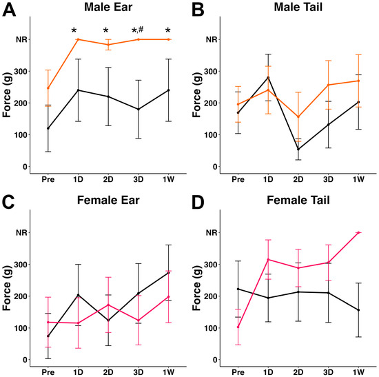 Plots of mean von Frey filament gram force that elicited a response in the (A,C) ear or (B,D) tail for (A,B) male or (C,D) female pigs prior to a TBI and up to 1 w following TBI. Male sham (n = 5) and female sham (n = 5) pigs are indicated as black lines. Male (n = 6) and female (n = 7) pigs sustaining a TBI are indicated as orange lines for males and pink lines for females. NR = no response to the highest gram force filament (300g). * p < 0.05 compared to pre-injury, # p < 0.05 compared to time-point matched sham.