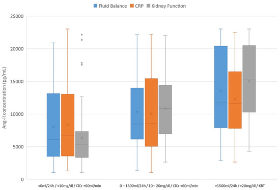 Ang-II concentrations in three different subgroups (fluid balance, CRP, kidney function). Note: The first three boxplots include patients with a fluid balance < 0 mL/24 h (blue), CRP < 10 mg/dL (orange), and creatinine clearance > 60 mL/min (gray). The second three boxplots include patients with a fluid balance 0–1500 mL/min (blue), CRP 10–20 mg/dL, and creatinine clearance < 60 mL/min (gray). The last three boxplots include patients with a fluid balance > 1500 mL/24 h, CRP > 20 mg/dL (orange), and kidney replacement therapy (gray). The boxes of the boxplots represent the interquartile range (IQR) and the horizontal line represents the median. The whiskers are limited to 1.5 times the IQR. The mean is indicated by the cross.