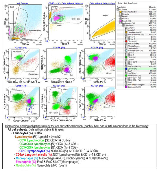 BAL samples were centrifuged, the cell pellet was washed with FACSFlow (Becton Dickinson; BD; San Jose, CA, USA) and resuspended in 0.5 mL of FACSFlow, and 50 µL of the sample was stained in a TrueCount tube (BD, San Jose, CA, USA) with the following monoclonal antibodies: CD1a-PE (HI149), CD3-BV510 (SK7), CD4-APC (SK3), CD8-PE-Cy7 (SK1), CD16-V450 (3G8), CD19-APC (SJ25C1), CD20-FITC (L27), CD45-APCH7 (2D1), and HLA-DR-PerCp (L243) from BD and CD66abce-FITC (Kat4c) from Dako (Santa Clara, CA, USA). A minimum of 0.5 million events were acquired in an 8-color FACSCanto-II flow cytometer (BD, San Jose, CA, USA) adjusted on a daily basis as previously described [31]. The analysis in Diva-Software 9.0 (BD, San Jose, CA, USA), following the gating strategy described in Figure 1, included both alive and dead cells (identified by the loss of FSC and SSC), as long as they maintained the expression of leukocyte markers.