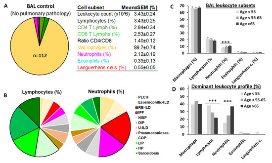 Figure 2. Lymphocytic ILDs decrease and neutrophilic ILDs increase with aging. (A) Mean values of leukocyte subset in bronchoalveolar lavage (BAL) of individuals without pulmonary pathology; (B) mean BAL lymphocyte and neutrophil values in patients with different types of interstitial lung disease (ILD); (C) mean values of macrophages, lymphocytes, neutrophils, eosinophils, and CD1a+ Langerhans cells in the BAL of total ILD patients according to age, at <55, 55–65, and >65 years; and (D) proportion of patients with lymphocytic (lymphocytes > 20%), neutrophilic (neutrophils > 10%), eosinophilic (eosinophils > 3%), and Langerhans cells (>1.5%) profiles, for patients aged <55, 55–65, and >65. ***, indicate p < 0.001 in the ANOVA test.