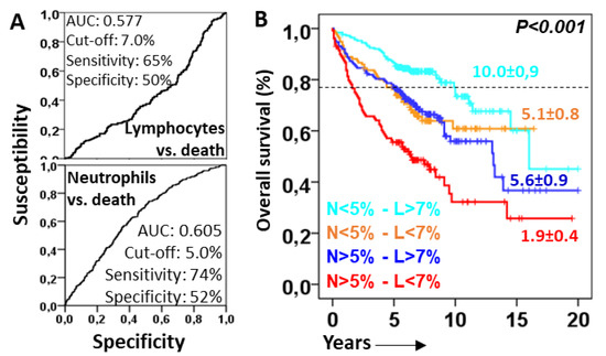 ROC analysis revealed cut-offs of 7.0% and 5.0% for lymphocytes and neutrophils, respectively, associated with favorable and unfavorable prognostic values for the OS (see Figure 3A for details). The combination of neutrophil and lymphocyte cut-offs showed four groups with different survival rates (Figure 3B): patients with neutrophils < 5% and lymphocytes > 7% showed the longest Q3–OS (10.0 ± 0.9 years, p < 0.001); patients with neutrophils > 5% and lymphocytes < 7% showed the shortest Q3–OS (1.9 ± 0.4 years); and patients with neutrophils < 5% and lymphocytes < 7% (5.1 ± 0.8 years) or neutrophils > 5% and lymphocytes > 7% (5.6 ± 0.9 years) showed intermediate Q3–OS. Therefore, lymphocytes seemed to counteract the deleterious effect of lung-infiltrating neutrophils.