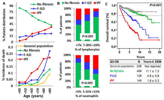 Figure 4. Incidence of fibrotic ILD (F-ILD), idiopathic pulmonary fibrosis (IPF), and death according to the age and the counts of lymphocytes and neutrophils in the BAL of patients. (A) Incidence of F-ILD, IPF, and death (estimated as the percentage of the sum of deaths divided by the sum of follow-up times of patients) according to the age of ILD patients; (B) incidence of F-ILD and IPF in patients according to the counts of lymphocytes (<7%, 7–20%, or >20%) and neutrophils (<5%, 5–15%, or >15%) in the BAL at diagnosis. p < 0.001 in the Chi-square test; and (C) Kaplan–Meier and Log-Rank tests for overall survival (OS) of the general population, ILD patients without fibrosis, and F-ILD and IPF patients. Pulmonary fibrosis was computed with the presence of reticular changes, traction bronchiectasis, and honeycombing in the radiological study. The 75th percentile OS (Q3–OS) is shown for each case.