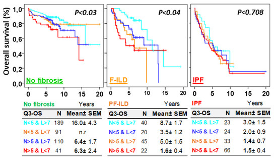 Figure 6. Neutrophil and lymphocyte counts were associated with the overall survival (OS) of ILD patients without fibrosis and with pulmonary fibrosis associated with ILDs (F-ILDs), but not with the OS of patients with idiopathic pulmonary fibrosis (IPF). Kaplan–Meier and Log-Rank tests for the OS of ILD patients according to the combinations of lymphocytes (above or below 7%) and neutrophils (above or below 5%) and the type of fibrotic process (F-ILD or IPF). Pulmonary fibrosis was computed with the presence of reticular changes, traction bronchiectasis, and honeycombing in the radiological study.