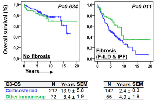 The type of immunomodulating therapies, consisting mainly of corticosteroids or other types of immunosuppressants (rituximab, azathioprine, mycophenolate mofetil, cyclophosphamide, or tacrolimus), was not associated with the differential OS of patients without fibrosis (p = 0.634). However, patients with fibrosis (F-ILD and IPF) treated with corticosteroids showed a shorter Q3–OS (2.4 ± 0.3 vs. 4.0 ± 1.9 years, p = 0.011) than patients treated with other immunosuppressants (Figure 7).