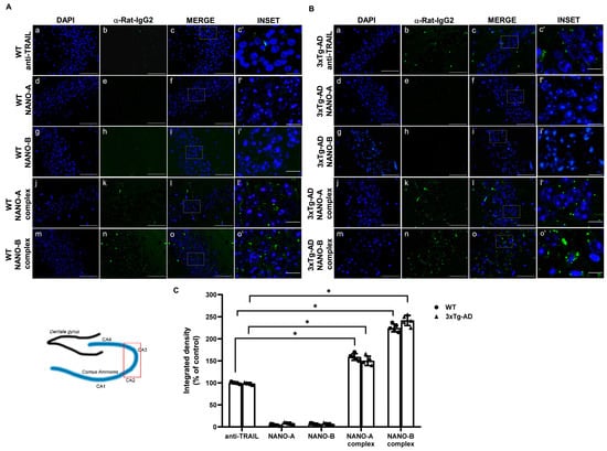 Comparison of polymeric or lipidic nanoparticles complexed with anti-TRAIL in the hippocampus of 3xTg-AD mice after intranasal administration. Representative immunofluorescence microscopy images showing the localization of the anti-TRAIL monoclonal antibody in the hippocampal sections from WT (A) or 3×Tg-AD (B) mice intranasally administered for 24 h with the anti-TRAIL monoclonal antibody, empty, or anti-TRAIL-loaded NANO-A, NANO-B nanoparticles. The fluorescence signal was detected by using a fluorescent secondary anti-rat IgG. The insets represent the respective areas magnified. (C) The densitometric count of fluorescence was performed with the aid of ImageJ software (available online: https://imagej.nih.gov/ij/ (accessed on 12 January 2022)) and represented as integrated density (% of control). Data are expressed as the mean ± SD. One-way ANOVA followed by Fisher’s LSD test was used for statistical analysis. * p < 0.05. (a–o scale bar = 50 µm; c’, f’, i’, l’, o’ scale bar = 10 µm).