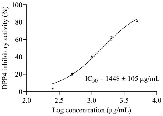 The DPP4 inhibitory activity of BMSP-GP hydrolysate was investigated. The half-maximal inhibitory concentration of a substance toward a specific biological function is commonly used to measure the efficacy of that substance [29]. Using five logarithmic concentrations of BMSP-GP hydrolysate versus their DPP4 inhibitory activities (%), the half-maximal DPP4 inhibitory concentration (DPP4 IC50) was determined to be 1448 ± 105 µg/mL (Figure 1).