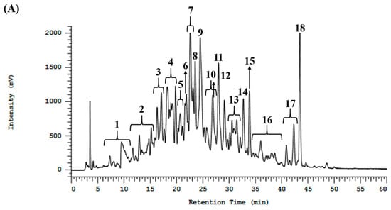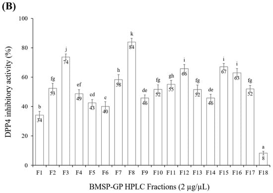 (A) RP-HPLC fractionation of BMSP-GP. (B) DPP4 inhibitory activity of RP-HPLC fractionation.
