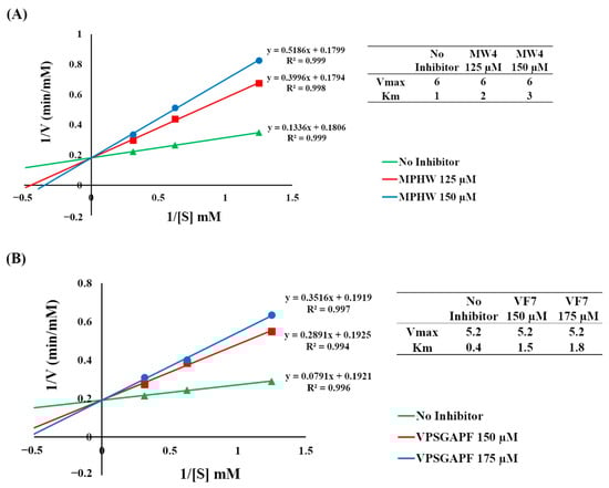 The inhibitory mechanism study of MW4 and VY7 toward DPP4, as well as MW4 toward ACE, was conducted using the Lineweaver–Burk plot. The Lineweaver–Burk plot for MW4 and VY7 (Figure 5A,B) suggested that these peptides inhibit DPP4 through a competitive mechanism. The Vmax values remained unchanged whether the inhibitors (MW4 and VF7) were present or not, suggesting that MW4 and VY7 compete with the DPP4 substrate for the enzyme’s catalytic sites. These results agreed with the previous study that DPP4 inhibitory peptides with proline or alanine at the N-termini penultimate were competitive inhibitors [42]. Because MW4 is also an ACEI peptide, its inhibitory mechanism toward ACE was assessed. The Lineweaver–Burk plot of MW4 (Figure 6) indicated that MW4 acts as a competitive inhibitor of ACE. This suggests that MW4 competes with the substrate, preventing it from binding to the active sites of ACE. This result aligns with previous studies indicating that ACEI peptides with a C-terminal tryptophan moiety primarily inhibit ACE at its active sites [22,29,41].