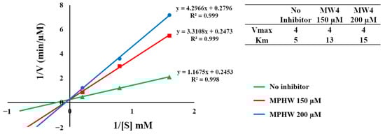 Meanwhile, the ACE inhibition pattern of MW4 was determined using three different concentrations of the substrate (HHL) and was performed both with and without the inclusion of the inhibitor (MW4). The Lineweaver–Burk plot of MW4 (Figure 6) suggested that MW4 inhibited ACE as a competitive inhibitor. The Vmax values were constant in the absence or presence of the inhibitor (MW4). This suggested that the MW4 may be competitive and prevent the substrate from binding with the active sites of ACE.