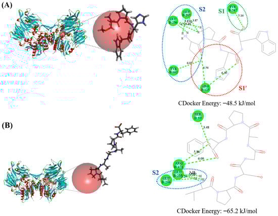 To clarify the molecular-level interaction of peptides with DPP4 and ACE, Discovery Studio 3.0 was employed using the integrated CHARMm (Chemistry at HARvard Macromolecular Mechanics) force field for dynamic energy calculation and molecular docking simulations. Being employed as receptor targets, the crystal structures of human DPP4–diprotin A (PDB Code = 1WCY) [26] and human ACE–lisinopril (PDB Code = 1O86) [27] were acquired from the Protein Data Bank. Peptides were subjected to blind docking with DPP4 utilizing a spherical binding domain (SBD) of 32.7 Å positioned at coordinates x: 107.8, y: 57.5, and z: 42.1. At the same time, blind docking simulations of peptides interacting with ACE were conducted using a 35.5 Å SBD sphere located at x: 39.2, y: 37.7, and z: 50.0. All molecular docking simulations were performed in triplicate. The CDOCKER energy score was applied to ascertain the optimal conformation.