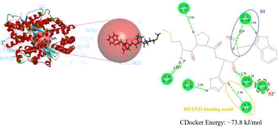 MW4 also exhibited ACE inhibitory activity. Thus, the molecular docking simulation of MW4 toward ACE was also conducted. The docking result of MW4 and human ACE (PDB code: 1O86) resulted in a CDOCKER energy of −73.8 kJ/mol (Figure 8). MW4 formed an intermolecular interaction with ACE amino acid residues, including Asn70, Glu143, His353, Ala354, Ser355, Ala356, and Glu411.