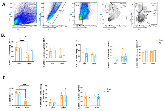 We analysed the distribution of the adaptive immune cells 7 days and 15 days post-immunization in spleen. At day 7, each CD4+ T cell subset and CD8+ T cell subset constituted about 40% of CD3+ T cells in both sham and AE mice (Figure 1A,B and Supplementary Figure S1). The CD4+ T cell population decreased at day 15 and represented 10% of CD3+ T (p < 0.0001) while the CD8+ subset increased and constituted 60% of CD3+ T cells (p < 0.0001).