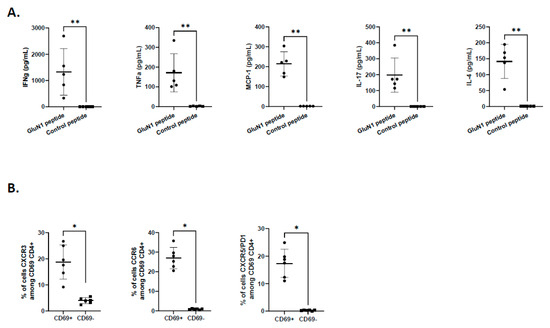 Functional profile of GluN1-specific T cells. (A) Splenocytes from immunized mice were cultured with GluN1 peptide or CLIP peptide for 48 h and supernatants were collected. Cytokine production was measured by ELISA (n = 5). (B) CD4+ T cells expressing the CXCR3, CCR6, and CXCR5/PD1 markers were identified among CD69+ or CD69− cells (n = 6). Data were expressed as mean ± SD. Normality could not be assumed so a non-parametric Mann–Whitney test was used (* p < 0.05; ** p < 0.01).