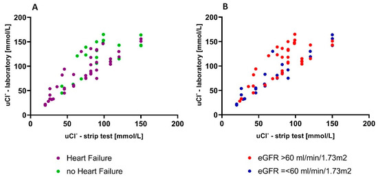 We divided the whole study cohort according to eGFR (eGFR > 60 mL/min/m2 (named: “low eGFR”) and eGFR ≤ 60 mL/min/m2 (“high eGFR”)). A well-fitted linear pattern was observed for patients with low eGFR (N = 26) (r = 0.94, p < 0.001), with a linear regression equation as follows: ((uCl-lab) = 0.96 × (uCl-strip) + 11.22; p < 0.001). Those with high eGFR (N = 40) also presented a linear correlation between the values obtained in both tests (r = 0.74; p < 0.001), but this was weaker than for the low-e-GFR group. The linear regression equation was as follows: (uCl-lab) = 0.92 × (uCl-strip) + 28.20; p < 0.001). This relationship is presented graphically in Figure 3B. The characteristics of the subgroups and the accuracy of fit between the ion concentrations measured in the laboratory and those established by strip testing, shown on Bland–Altman plots, are provided in the Supplementary Materials.