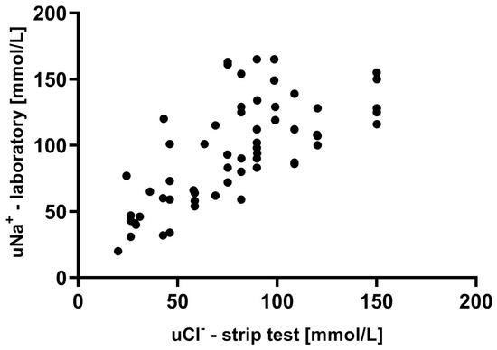 The presented study shows a high correlation between the urine chloride evaluated in strip tests and urine chloride and/or sodium assessment using the gold-standard laboratory method. The results of this study reveal several significant implications.