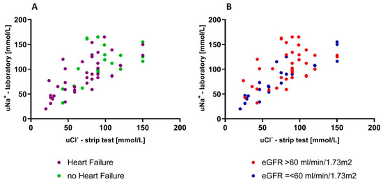 The correlation between both measured values in HF patients was r = 0.71 (p < 0.001), and in the no-HF subgroup r = 0.52 (p = 0.02). These linear relationships can be described by the following equations: (uNa-lab) = 0.80 × (uCl-strip) + 30.68; p < 0.001 and (uNa-lab) = 0.59 × (uCl-strip) + 56.16; p = 0.02), respectively. This is presented in Figure 5A.