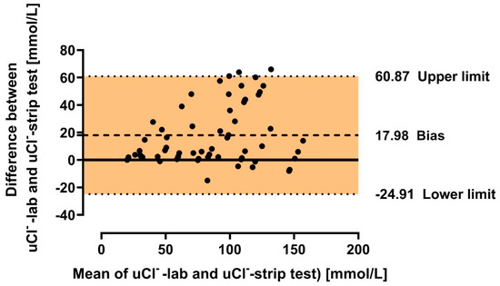 In general, the relationship pattern is linear (with correlation r = 0.85; p < 0.001), but the results are dispersed over 40 mmol/L uCl− with the strip test, especially for higher concentrations of uCl. Nevertheless, discrepancies resulted from the underestimation of uCl in the strip test (laboratory-assessed uCl was, in general, equal to or higher than that measured by the strip test).