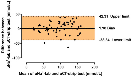 Bland–Altman plot for agreement of urine chloride concentration measured by strip test and urine sodium measured in the laboratory in the general cohort. Legend: uCl−—urine chloride; uNa+—urine sodium; Bias—mean difference between strip test and laboratory test results; Lower limit—mean difference-1.96 × standard deviation; Upper limit—mean difference + 1.96 × standard deviation.