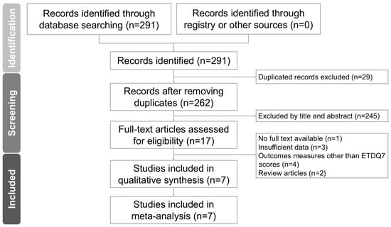 The literature search process is presented in the PRISMA flowchart (Figure 1). A total of 291 articles were identified through a systematic search of databases. Following the exclusion of 29 duplicate publications and 245 ineligible studies after title and abstract review, we retrieved 17 articles for full-text review. Seven observational studies ultimately met the criteria, and were included in the meta-analysis. Out of the 10 excluded articles in the final stage, one study had no full text available [], while three studies had insufficient data, either missing postoperative mean ETDQ7 scores or standard deviations [,,]. Four studies were excluded because ETD symptoms were measured with changes in SNOT-22 otologic subdomain scores or the type of tympanometry, thus disallowing useful comparisons to be drawn for the primary outcome [,,]. The remaining two studies were systematic reviews [,]. Therefore, seven studies [,,,,,,] were included in this systematic review and meta-analysis. All studies were observational in design, including five prospective cohort studies [,,,,], one prospective case–control study [], and one retrospective cohort study [].