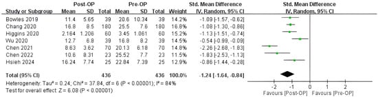 Meta-analysis of continuous measures, namely mean preoperative and postoperative ETDQ7 scores, was performed with Cochrane Review Manager (RevMan) version 5.4 (The Cochrane Collaboration 2020). Due to the variation between the enrolled studies such as target populations and mean outcome measures, a random-effects model was used to run the analysis. The proportion was weighted according to the number of subjects in each study. The effect size of the primary study outcome was quantified using the standardized mean difference and 95% confidence intervals (CIs), since not all the included studies employed the same scale to measure ETDQ-7 scores. The degree of statistical heterogeneity across studies was evaluated by I2 and Cochrane’s Q test. I2 statistics of 25%, 50%, and 75% were estimated as low, moderate, and high heterogeneity, respectively [].