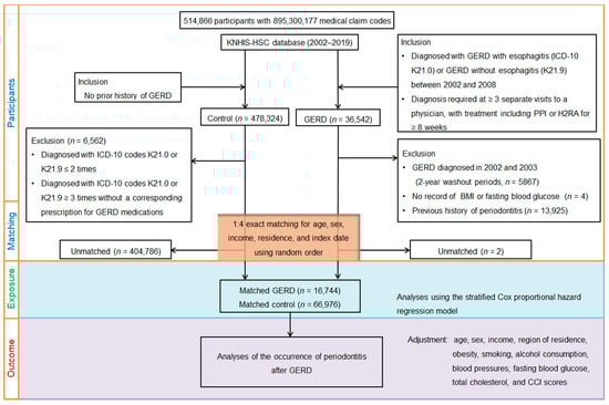 APA StyleLee, N.-E., Han, K. M., Yoo, D. M., Kang, H. S., Kim, J. H., Kim, J.-H., Bang, W. J., Choi, H. G., Park, H. Y., Kim, N. Y., & Kwon, M. J. (2024). Association Between Gastroesophageal Reflux Disease and Periodontitis: A Longitudinal Follow-Up Study from the Korean National Health Screening Cohort. Biomedicines, 12(11), 2491. https://doi.org/10.3390/biomedicines12112491