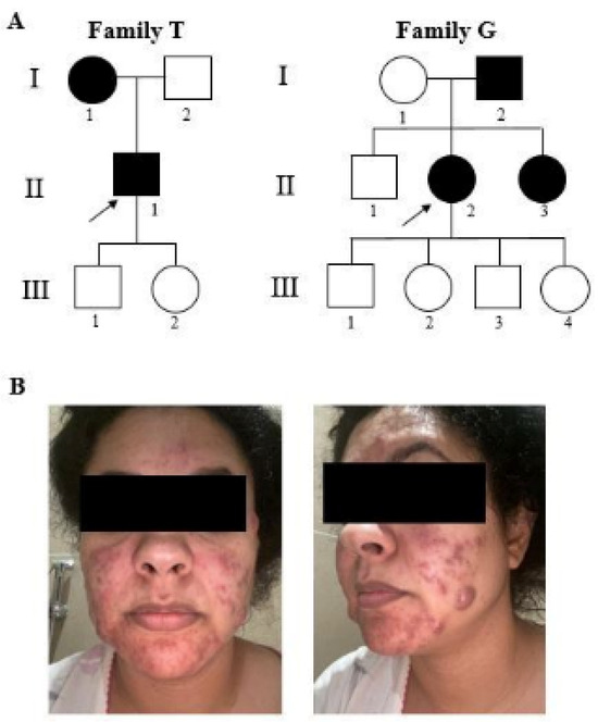 The patient was 37 y/o (II-1T) at the time of our clinical evaluation (2021). He was referred because of recurrent episodes of subcutaneous abscesses in the face and the rest of the body during the previous 5 years, for which he was constantly under antibiotic treatment, with some relief. When he was 16 y/o, he suffered from juvenile pustular acne, treated with vitamin A and laser therapy. A rheumatological evaluation ruled out possible Bechet’s disease after negative HLAB51 and HLAB27 tests and normal sacroiliac MRI results; a possible systemic autoinflammatory condition was suspected, and a dermatological evaluation raised the suspicion of an infectious condition, indicating the need to carry out a biopsy of the skin lesion, which was not refused by the patient. He reported that his mother also suffered from skin abscesses (Figure 1A). Based on the clinical phenotype and on the family history, a multigene panel for autoinflammatory diseases was analyzed, with normal results. Affected family members also had striking facial lesions, and a comorbidity of acne conglobata was actually present. They did not have any of the known risk factors. We then performed exome analysis on a research basis. No other subjects from this family took part in the study.