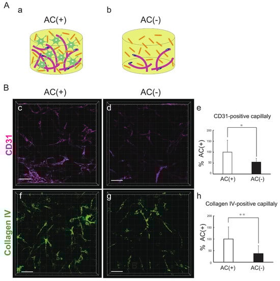 On the basis of the results described above, we speculated that an increase in the number of ACs would be advantageous for capillary network formation. We therefore generated BBB–NET with and without ACs (Figure 3A). After quantifying the CD31–positive capillary volume with IMARIS software (Figure 3B, c–e), it was revealed that the capillary volume significantly decreased when ACs were removed from the CMF (+) hydrogel (Figure 3B, e); 54.6 ± 16.7% that of the AC (+) group). We also examined the effects of ACs on capillary basement membrane formation by observing the expression of collagen IV, one of the major components of the basal membrane (Figure 3B, f–h). The volume of collagen IV–positive capillaries was significantly decreased when the ACs were removed (Figure 3B, h); 37.1 ± 33.9% that of the AC (+) group). In addition, the signal strengths of both CD31 and collagen IV increased. These results indicate that the positive effects of CMFs are mediated by an increase in AC survival, which promotes capillary formation and maturation.