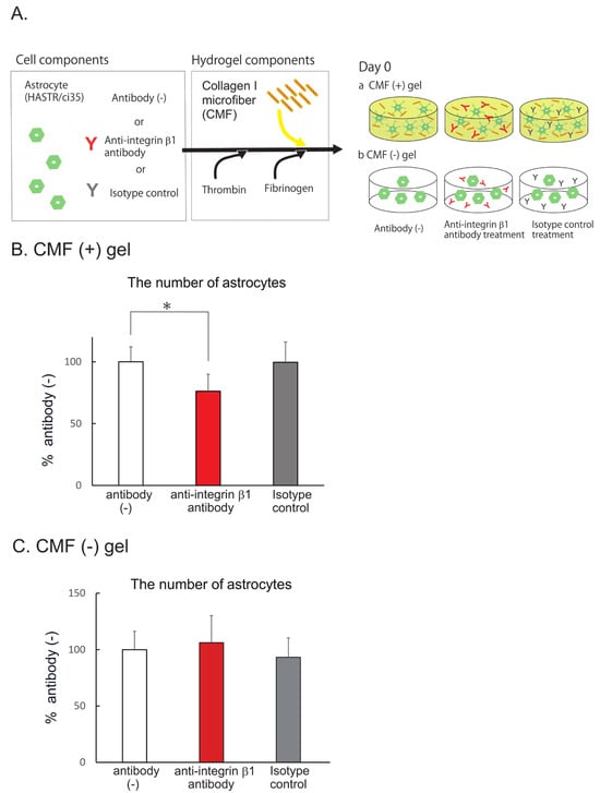 CMFs interact with astrocytes via the integrin β1 subunit. (A) Schematic of AC pretreated with and without each antibody in hydrogels with (a) and without CMF (b). (B) Comparison of the number of astrocytes after pretreatment with an integrin β1 antibody or an isotype control in hydrogels with CMFs. Each representation shown is from three independent experiments, each with four images. Student’s t test, *: p < 0.05. (C) Comparison of the number of astrocytes after pretreatment with an integrin β1 antibody or an isotype control in hydrogels without CMFs. Each representation shown is from two independent experiments, each with four images.