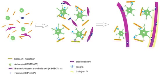 Collagen I microfibers (CMFs) were established by Prof. Matsusaki [] and supplied by the Toppan Technical Research Institute. Gel preparation was described by Agathe F. et al. []. Briefly, 70 μL of gel containing 0.7 mg of CMFs was mixed with 0.4 mg of fibrinogen in 40 μL of DMEM in one tube, while in another tube, 2.0 × 105 HBMECs/ci18, 4.0 × 105 HASTRs/ci35, and 1.0 × 105 HBPCs/ci37 were mixed with 0.3 U of thrombin in 30 μL of VascuLife complete medium. The solution was mixed just before being added to the top of a previously plasma–treated and fibronectin-coated culture insert. After 45 min of gelation, 2 mL of mixed media (1:1:1 complemented VascuLife/pericyte medium/astrocyte medium) was added. The gels were incubated for 7 days at 37 °C in a humidified atmosphere with 5% CO2, and the medium was changed every 3–4 days (Figure 1A).