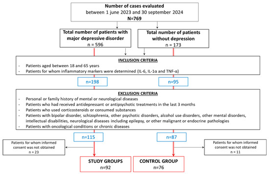 The general inclusion criterion was an age range of 18 to 65 years. A series of clinical and demographic characteristics, along with their associations with inflammatory markers (IL-6, IL-1α, and TNF-α), were analyzed for the subjects included in the study. The study group consisted of 92 patients with major depressive disorder (MDD), while the control group included 76 patients without depression and with no personal or family history of psychiatric or neurological diseases (Figure 1).