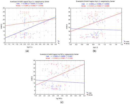 The results were analyzed for Pearson’s correlations of pro-inflammatory cytokines (IL-1α, IL-6, TNF-α) with psychometric measures per cohort, group (HAM-D and control), and sex (females and males) (Figure 2). The correlation analysis conducted separately for each group based on gender indicated a significant correlation between the HAM-D score and log IL-1α for male patients (r = 0.3550, p = 0.0014) and with IL-6 for female patients (r = 0.3131, p = 0.0027). TNF-α values showed a significant correlation with HAM-D only in female patients (r = 0.3922, p = 0.0001) (Figure 2).