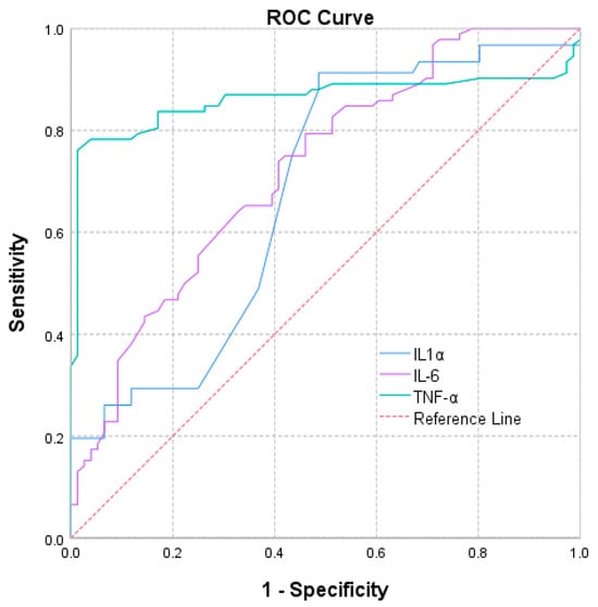 The predictive value of the cytokines IL-1α, IL-6, and TNF-α in the discrimination of patients with severe depression was assessed based on the AUC values (Table 6), which is also presented graphically by the ROC curve (Figure 3).