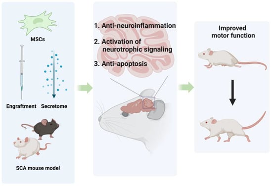 This section summarizes the studies that investigated the effects of MSCs or their properties in animal models of SCA (Figure 2). Two studies, those of Tsai et al. [5] and Oliveira et al. [8], demonstrated the effects of direct MSC engraftment in SCA mouse models. Moreover, three additional studies—those of Correia et al. [7], Suto et al. [6], and You et al. [9]—investigated the effects of introducing subcellular components derived from MSCs, such as secretome or exosomes, in SCA mouse models.