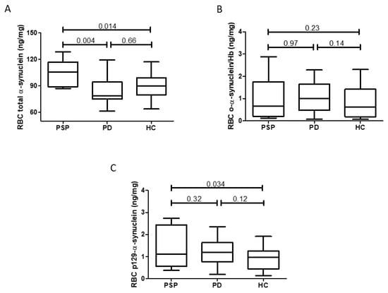 Erythrocytic concentration, corrected for Hb content, of total (A) oligomeric (B) and p129- α-synuclein (C) in PSP patients (n = 8), PD patients (n = 19), and HC (n = 18). Data are summarized as box plots, in which the lower, upper, and middle lines of boxes represent the 25th percentile, 75th percentile, and median, respectively, while limits of vertical lines indicate ranges. Shown p-values were obtained by ANCOVA with age and sex as covariates followed by Turkey’s LSD post hoc test. o-α-synuclein = oligomeric α-synuclein; PSP = progressive supranuclear palsy; PD = Parkinson’s disease; HC = healthy control.