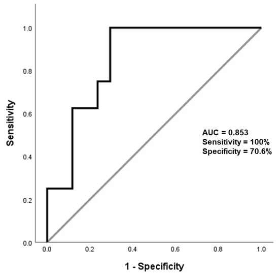To evaluate the accuracy of total α-synuclein/Hb ratio as biomarker to discriminate PSP patients from PD patients, an ROC curve was constructed and the area under the curve (AUC) was calculated. The analysis showed that total α-synuclein/Hb ratio effectively distinguished PSP patients from PD patients (p-value: 0.004), with an AUC of 0.853, with a sensitivity of 100% (95% CI: 63.06–100%), a specificity of 70.6% (95% CI: 41.34–88.98%), and a value of 85.06 ng/mg total α-synuclein/Hb was set as the cut-off (Figure 2).